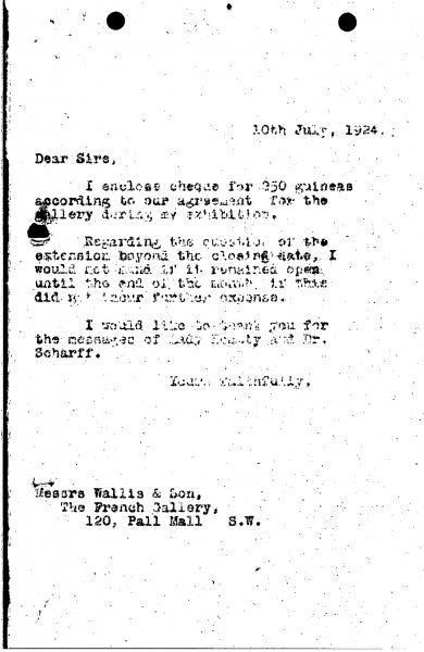 De László encloses an agreed payment and expresses willingness to extend the exhibition (French Gallery, June 1924), provided no extra costs are incurred.