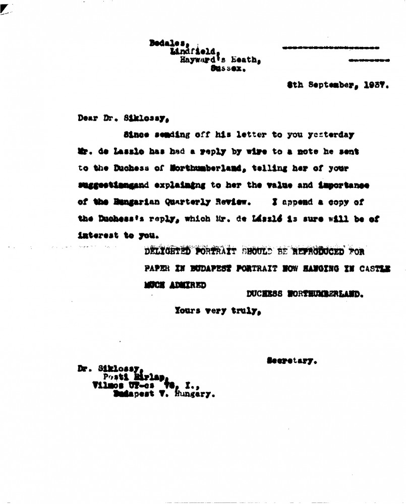 The Duchess of Northumberland has confirmed by telegram her delight in having her portrait [6868] reproduced in the Hungarian Quarterly Review.