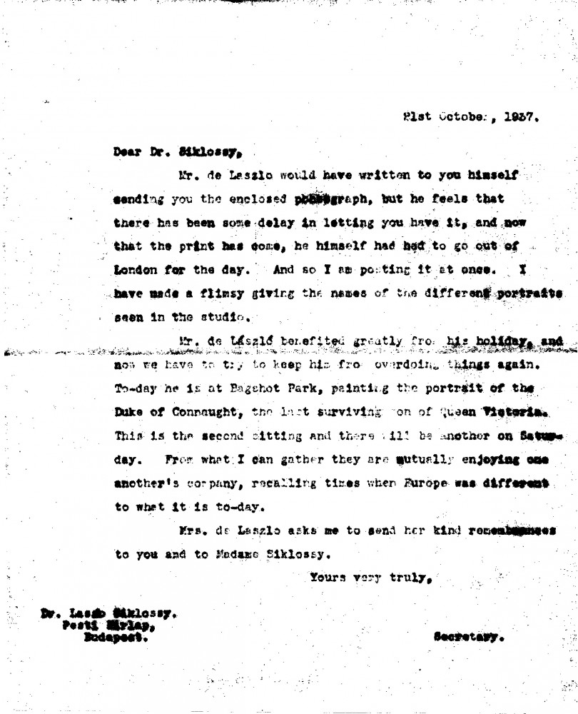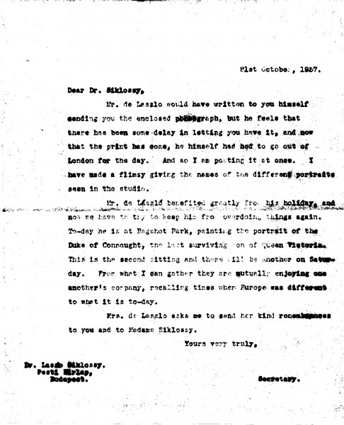 De László’s secretary encloses a photograph from his studio, along with a list identifying the portraits. Refreshed by a recent holiday, he is now at work on a portrait of the Duke of Connaught [4117].