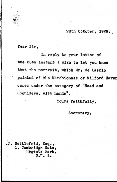 De László's secretary confirms that the Marchioness of Milford Haven's portrait [3491] falls under the “Head and Shoulders, with hands” fee category.