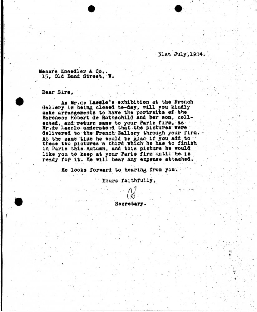 Return of the portraits of Baroness Robert de Rothschild and her son [4625][4893] to Knoedler's Paris branch following their exhibition (French Gallery, 1924). A third, unfinished portrait is to be added and held in Paris until de László is ready to complete it.