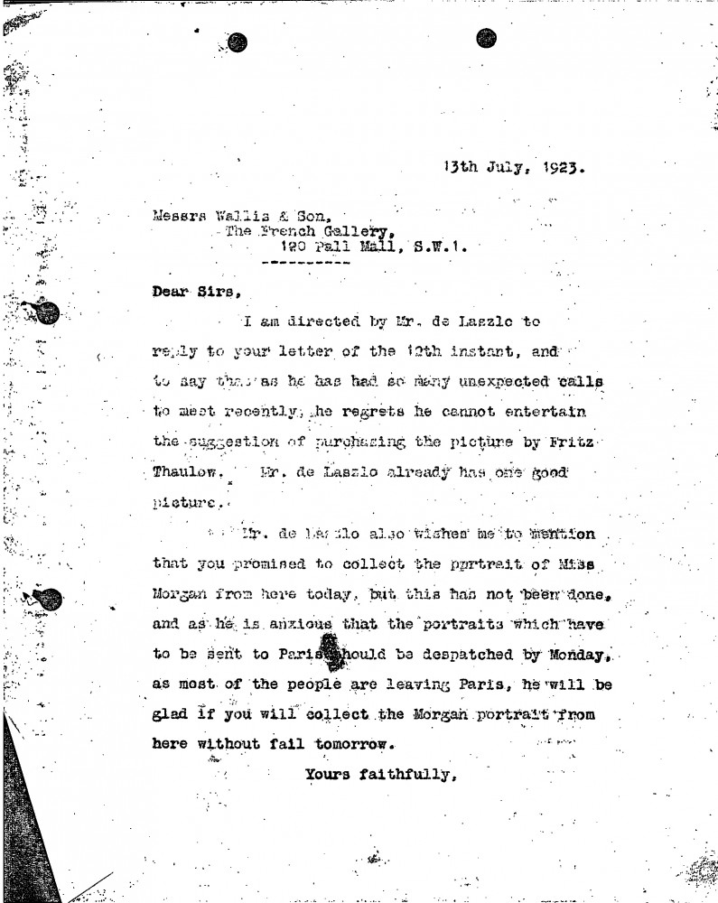 De László declines to purchase the Frits Thaulow picture (see DLA106-0039). The portrait of Miss Morgan [3912] requires collection.