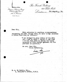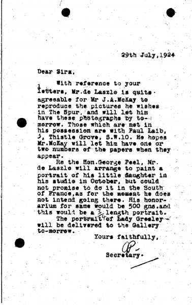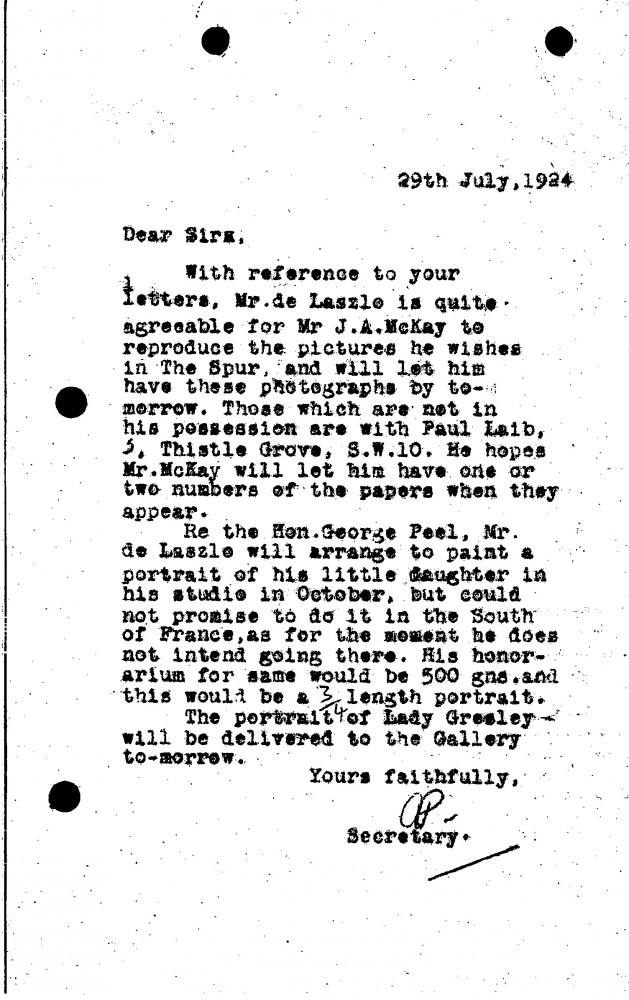De László agrees for selected pictures to be reproduced in The Spur. He agrees to paint the Hon. George Peel’s daughter in his studio, quoting a fee of 500 guineas for a three-quarter-length portrait. Transportation of Lady Gresley's portrait [9916] to the French Gallery.
