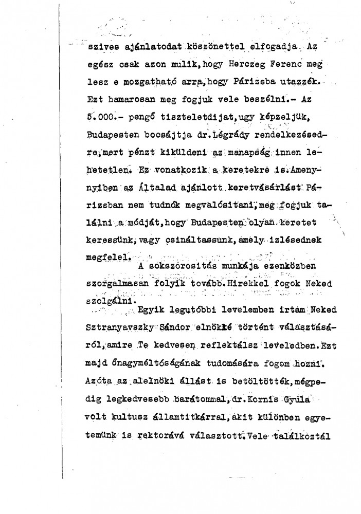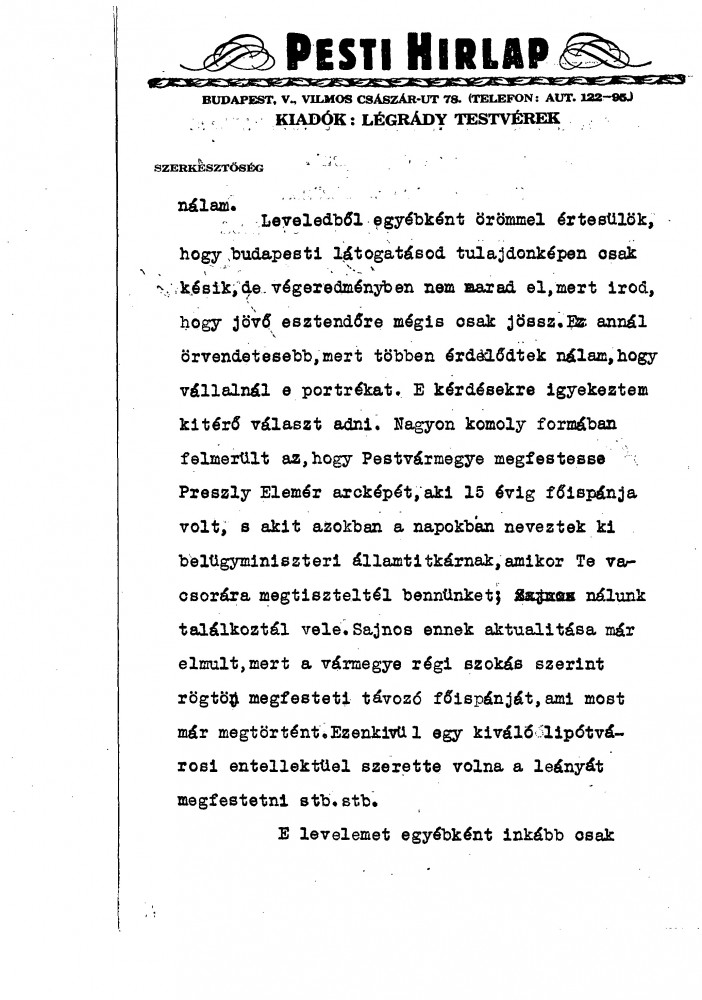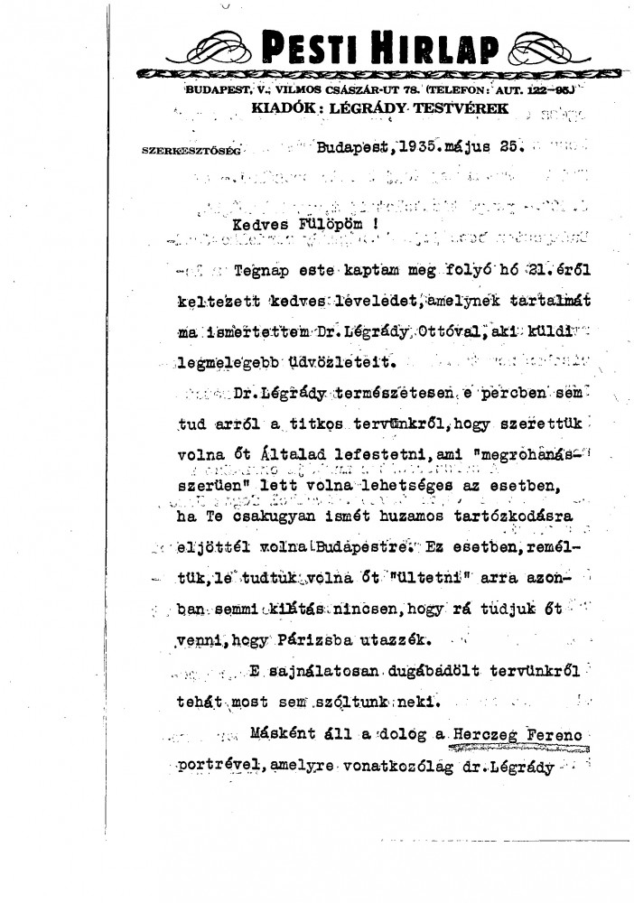 Plans to paint Légrády in Budapest have fallen through, but efforts to arrange sittings with Herczeg in Paris continue. Payment, framing logistics, and work on the Regent’s portrait reproductions are underway. Recent political appointments in Budapest and possible commissions from Elemér Preszly and a young woman (Duplicate of DLA138-0020).