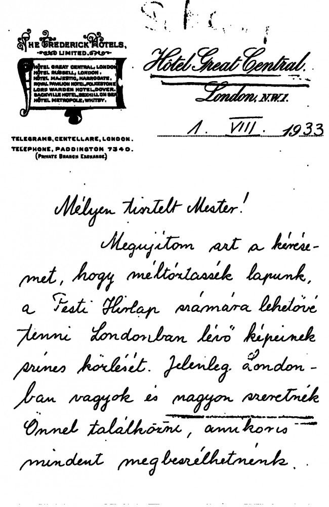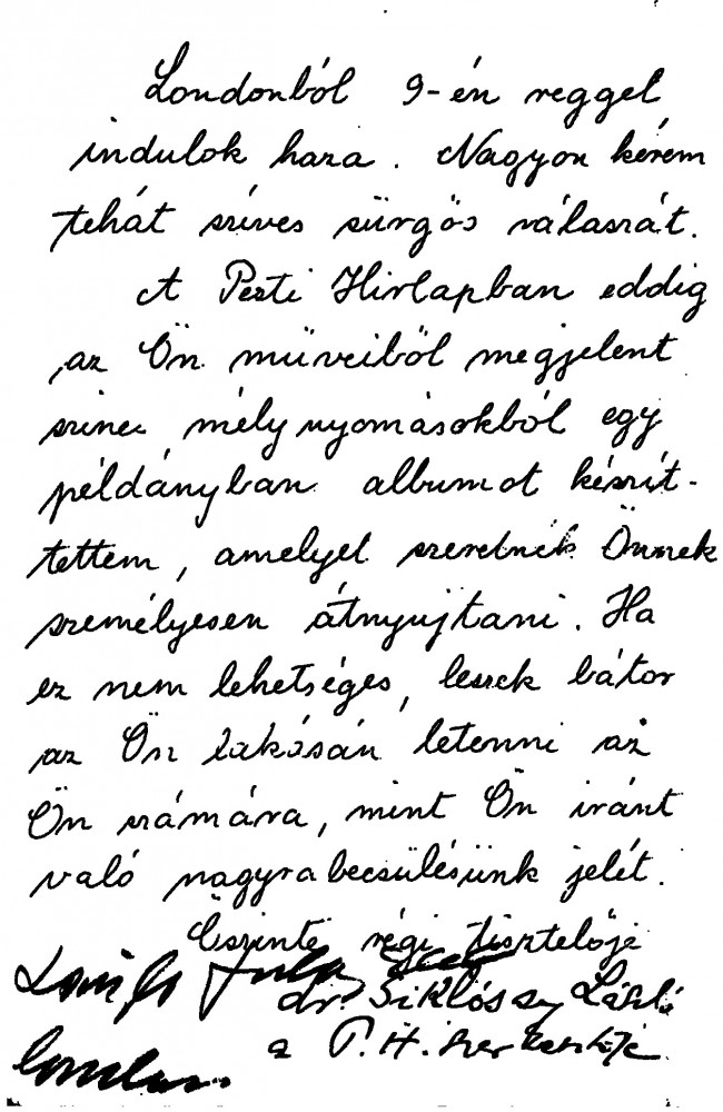 Siklóssy requests permission to publish colour reproductions of de László’s works in Pesti Hírlap. Currently in London, he hopes to present the artist with a special album featuring reproductions previously published in the newspaper.