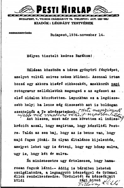 Siklóssy thanks de László for the photographs, which he has published together with an article on the front page of Pesti Hírlap's supplement. Mentions de László's forthcoming visit to Budapest (typed text is duplicated in DLA138-0011).