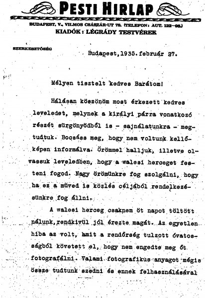 Siklossy is pleased de László will paint the Prince of Wales, who enjoyed his visit to Budapest despite photography restrictions. He sends a special English edition covering the visit and asks about a large-format album of de László’s work for future reproductions.