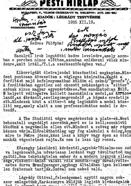 Siklóssy thanks de László for the corrections to the biography, explaining a translation challenge with the word “sitter.” Plates have arrived for the Hungarian translation of "Painting a Portrait" but are delayed by customs. Advises de László to avoid László Kőszeghy, describing him as unpleasant despite his artistic talent. Verso of the sheet includes a list of names in de László’s hand.