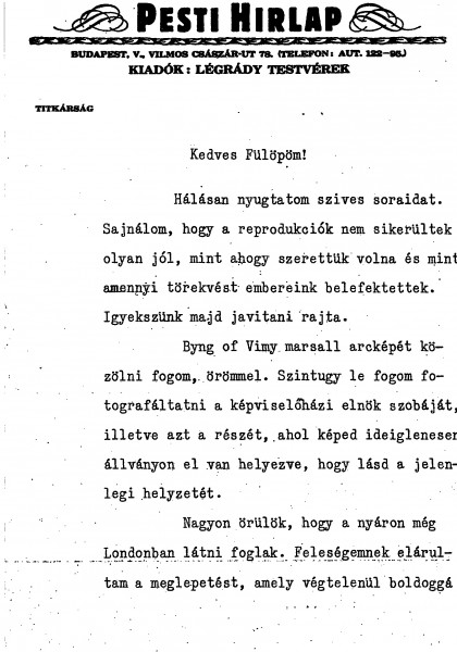 Siklóssy regrets the poor quality of reproductions, promising improvement. He agrees to publish the portrait of Marshall Byng [3666], and will photograph the Speaker of the House's office, where the artist's portrait [of the Regent] [110886] is temporarily displayed.