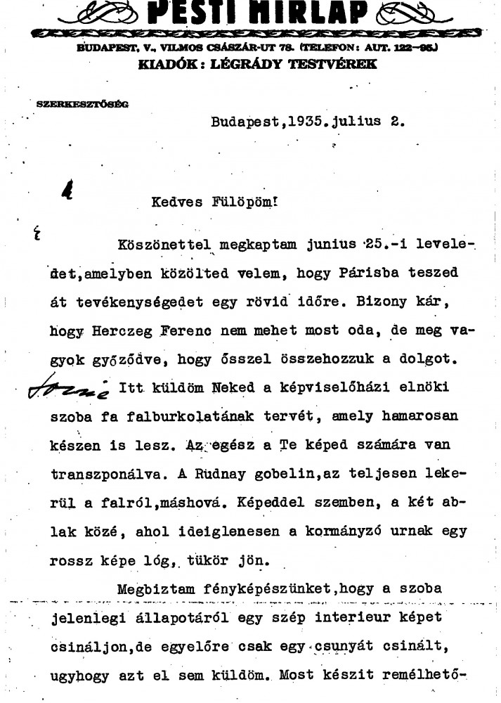 Siklóssy acknowledges de László's temporary move to Paris and regrets Herczeg’s inability to join him. He shares plans for the redesigned Speaker’s office, tailored to best display the Regent’s portrait [110886], and mentions efforts to obtain a better interior photo. He will soon travel to North Cape and then London.