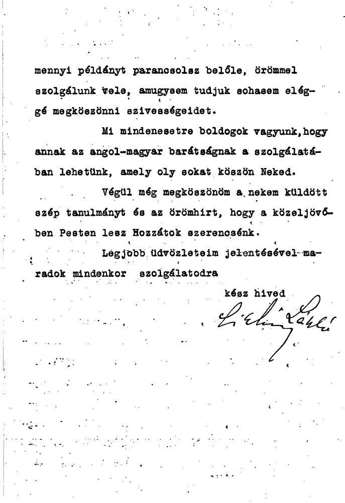 Siklóssy requests larger-format colour prints of the artist’s work for inclusion in a special anniversary edition of the Pesti Hirláp celebrating British-Hungarian friendship.