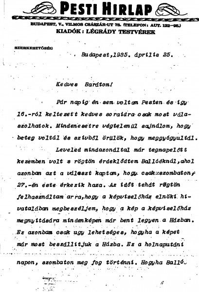 Siklóssy updates de László on arrangements to varnish and hang the portrait of the Regent [110886] in Parliament before the State Opening, confirming it will be in place by 1 May. He has written about the artist’s donation to the Save the Children Fund in Hungary and promises to send press cuttings (typed text is duplicated in DLA138-0015).