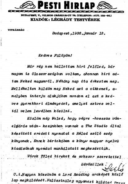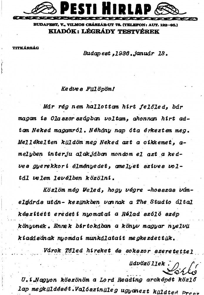 Siklóssy encloses an article published in the Pesti Hirláp based on a childhood anecdote shared by de László. Work has begun on preparing the Hungarian edition of "Painting of Portrait" for printing. He thanks the artist for sending a paper featuring the portrait of Lord Reading [6747].