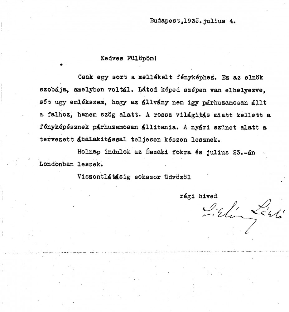 Siklóssy sends a photograph of the Speaker’s office showing Horthy’s portrait [110886], noting the planned refurbishments to the room. He mentions his upcoming travel to London via North Cape.