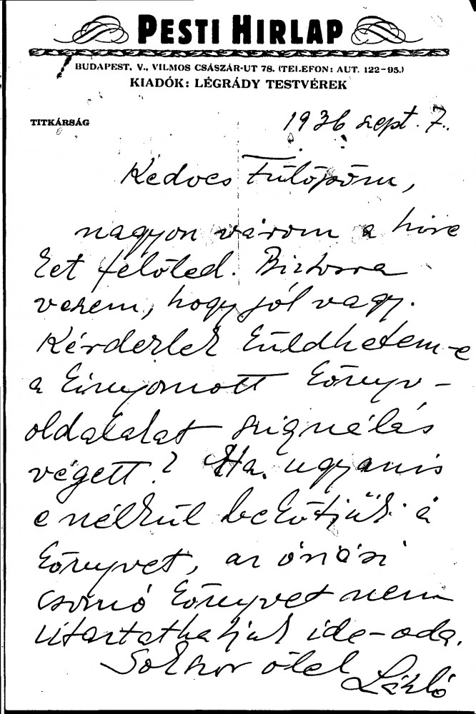 Letter from Dr László Siklóssy to de László, Hungarian Letters 1936, 037-0010