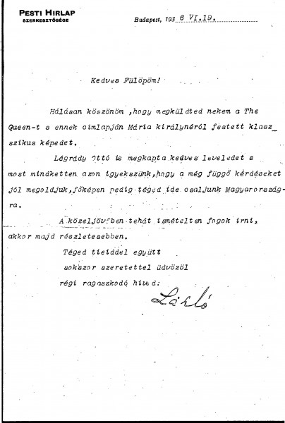 Siklóssy thanks de László for sending "The Queen" featuring his portrait of Queen Marie [3211]. He and Légrády are working to resolve outstanding matters to encourage the artist's visit to Hungary.
