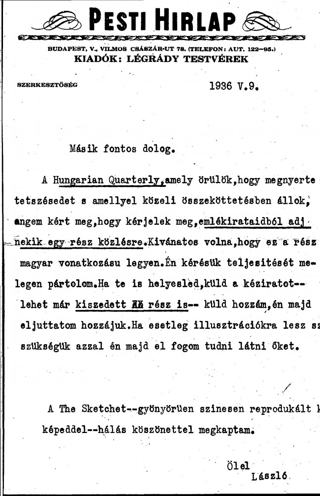 Siklóssy conveys a request from the "Hungarian Quarterly", which is seeking to publish an excerpt from de László’s memoirs, preferably one with a Hungarian connection. Expresses gratitude for "The Sketch", featuring two of de László’s paintings.