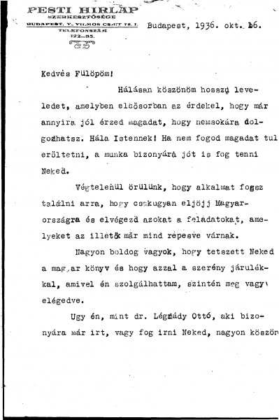 Siklóssy expresses joy at de László’s improving health and plans to return to work, especially his intended visit to Hungary. Pleased de László liked the Hungarian edition of "Painting a Portrait" and thanks him for the "Apollo". Acknowledges a note from Lucy de László.