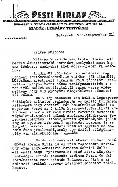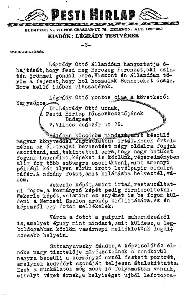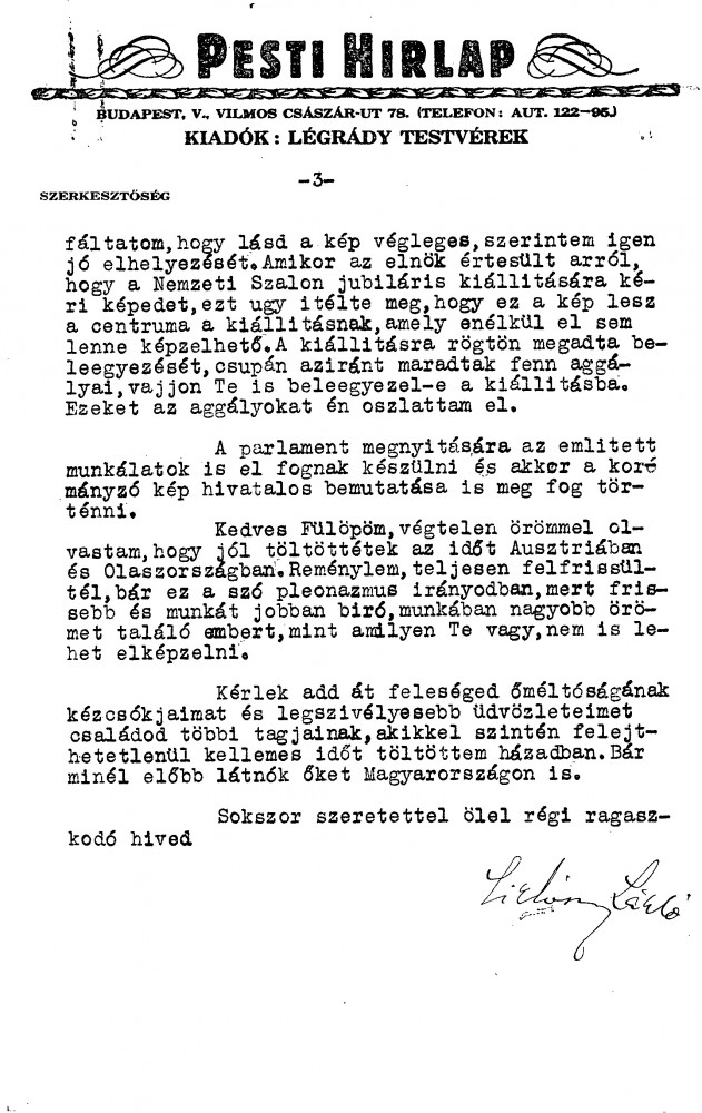 Siklóssy's portrait [111404] has been praised by notable figures (Herczeg, Kornis). Légrády still hopes de László will paint Herczeg. He agrees to a 4-page preface for the Hungarian edition of “Painting a Portrait”. Plans to exhibit portraits of himself and Wekerle [possibly 111100] (Nemzeti Szalon, Oct 1935). The Regent’s portrait [110886], much admired by Sztranyavszky, will feature prominently in the exhibition; it will be officially unveiled at the opening of Parliament.