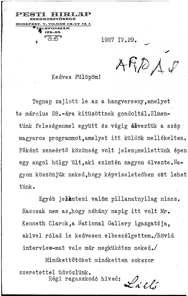 Siklóssy reports attending a concert, thanks de László for the opportunity to represent him, and mentions a discussion about the artist with National Gallery Director Kenneth Clark.