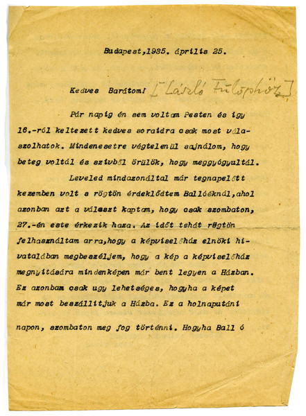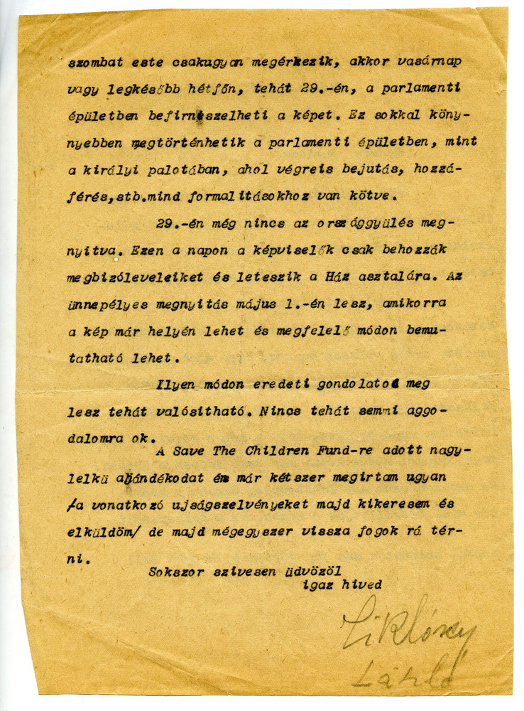 Siklóssy updates de László on arrangements to varnish and hang the portrait of the Regent [110886] in Parliament before the State Opening, confirming it will be in place by 1 May. He has written about the artist’s donation to the Save the Children Fund in Hungary and promises to send press cuttings (typed text is duplicated in DLA036-0014).