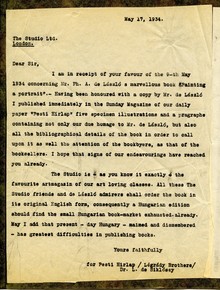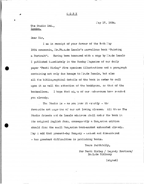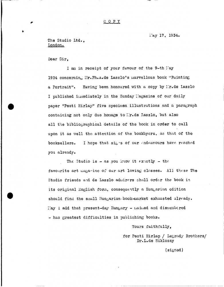 Siklóssy acknowledges receipt of a letter concerning de László’s book "Painting a Portrait". He promoted the publication in Pesti Hírlap with illustrations and a write-up. Many in Hungary will order the English edition, leaving little demand for a Hungarian version. He mentions the country's difficulty in publishing. Letter marked "COPY". See also DLA138-0010.