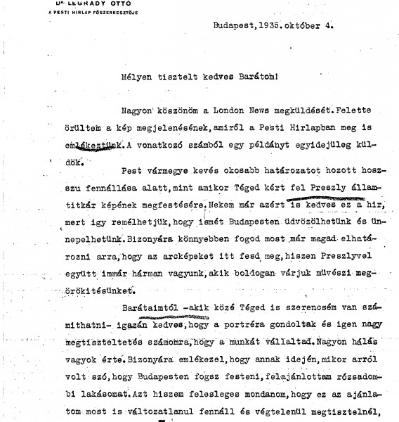 Légrády thanks de László for sending the London News and encloses the Pesti Hírlap. Commission from Pest County to paint Elemér Preszly's portrait, noting that several others, himself included, hope to have their portraits painted. The Prince of Wales' popularity in Hungary. Supportive of de László’s plan to write a memoir.