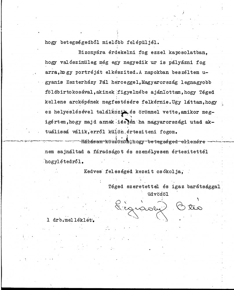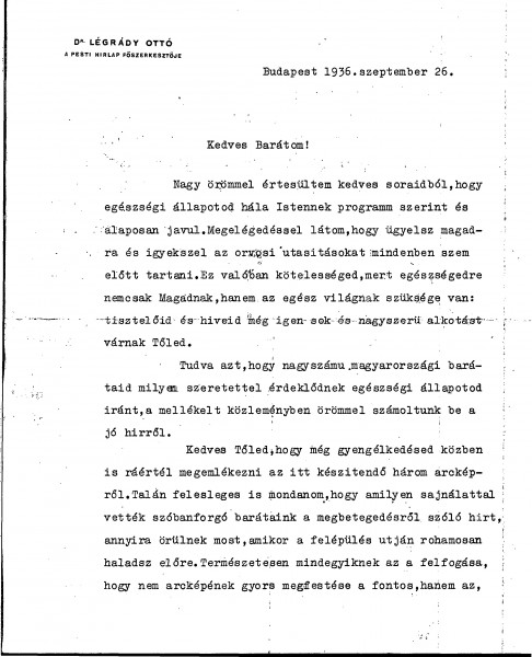 Légrády expresses joy at de László’s recovery; sitters in Hungary awaiting portraits are more concerned with the artist's well-being than timing. He mentions a potential new commission from Prince Pál Eszterházy.