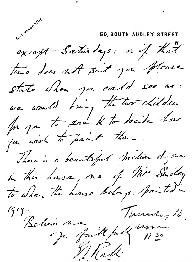 Eustratio Lucas Ralli requests a meeting with de László to discuss the possibility of painting a portrait of his children [2681], referring to earlier correspondence prior to the artist’s trip to America. He mentions an existing portrait by de László of Mrs Smiley [10763] displayed in the house.