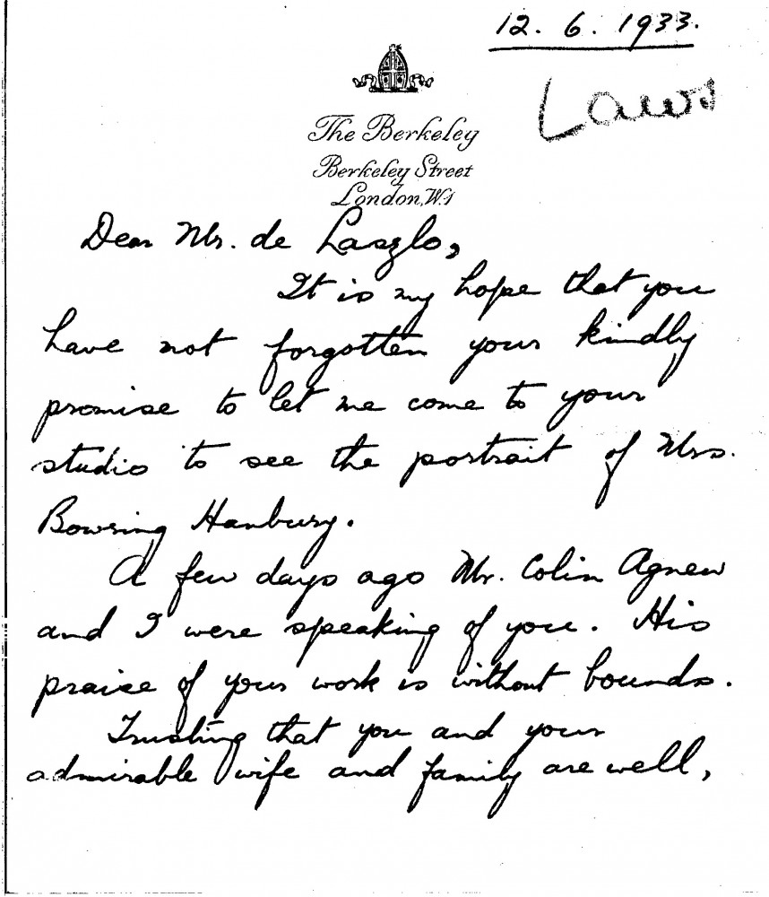 Laws hopes to visit de László’s studio to see the portrait of Mrs. Bowring-Hanbury [9806]. He mentions Colin Agnew’s high praise of the artist's work.