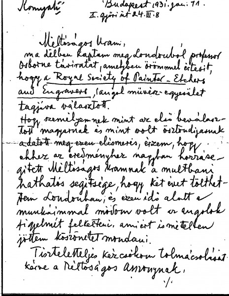 Komjáti has become a member of the Royal Society of Painter-Etchers and Engravers, the first Hungarian artist to be given the honour. He thanks de László for his support during his two years in London.