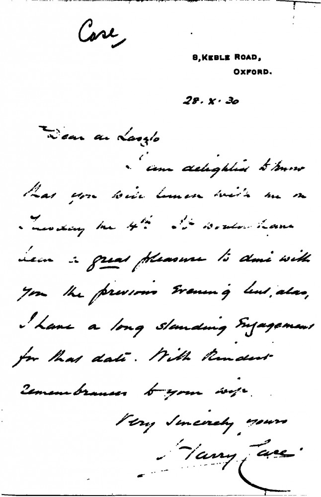 Harry Case is delighted de László will lunch with him on Tuesday, 4th November [1930]; regrets he is unavailable for dinner on 3rd.