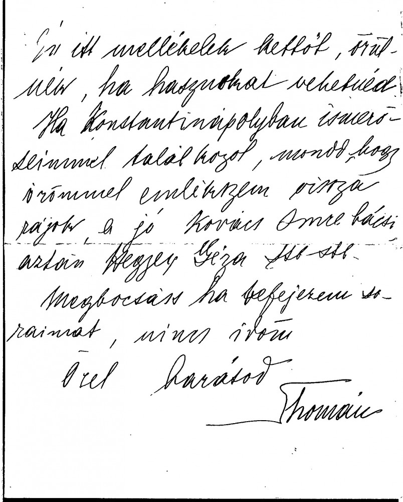 Thomán congratulates de László on royal commissions [3937][3715][3712][3934]. Refers to a recommendation letter that Thomán will obtain from his father-in-law; encloses two others. De László’s travel to Constantinople, mentions people Thomán knows there: Imre Kovács and Géza Hegyey.