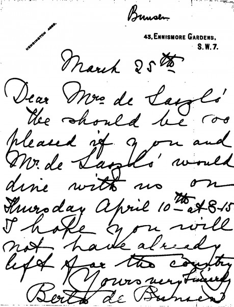 Lady Berta Mary de Bunsen invites Lucy and de László to dinner (DLA018-0088 was previously archived with this item).