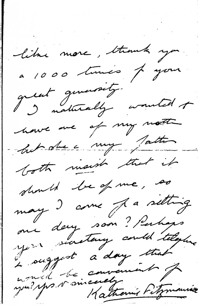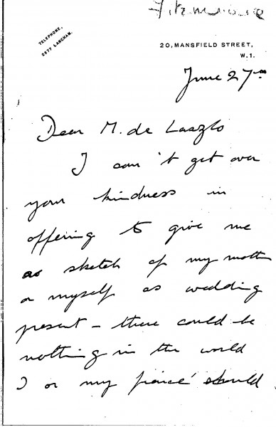 Lady Katherine Petty-Fitzmaurice thanks de László for offering a sketch portrait as a wedding gift, and arranges a sitting for herself rather than her mother, as her parents requested.