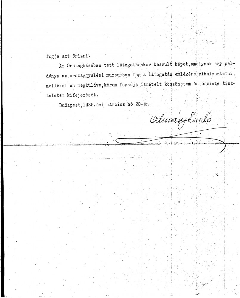 László Almássy thanks de László for painting a portrait of the Regent Horthy [110886] for the Hungarian House of Representatives. Encloses a photograph taken on the occasion of the artist's visit to the House. Item includes a draft reply from de László thanking Almássy for his hospitality and noting the pride he feels in being able to offer a portrait of a "forever eminent" and "shining star" of Hungarian history to the nation.