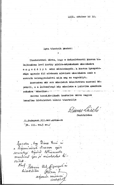 László Dienes requests de László’s permission to make a copy of his portrait of Regent Miklós Horthy in the Museum of Fine Arts [5684]. The copy is intended for the Ludovika Academy. A handwritten note beneath the typescript affirms Dienes’s experience in producing accurate copies of museum works.
