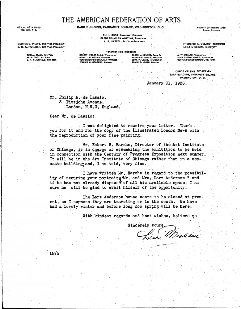 Leila Mechlin has recommended de László's portrait of Mr and Mrs Larz Anderson [2589] for inclusion in the upcoming "Century of Progress" exhibition in the Art Institute of Chicago; she shares a brief update on the Andersons.