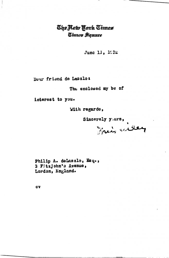 Louis Wiley sends something to de László that might be of interest (possibly newspaper clippings).