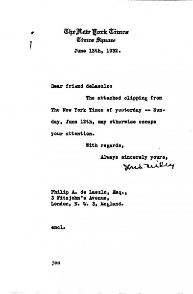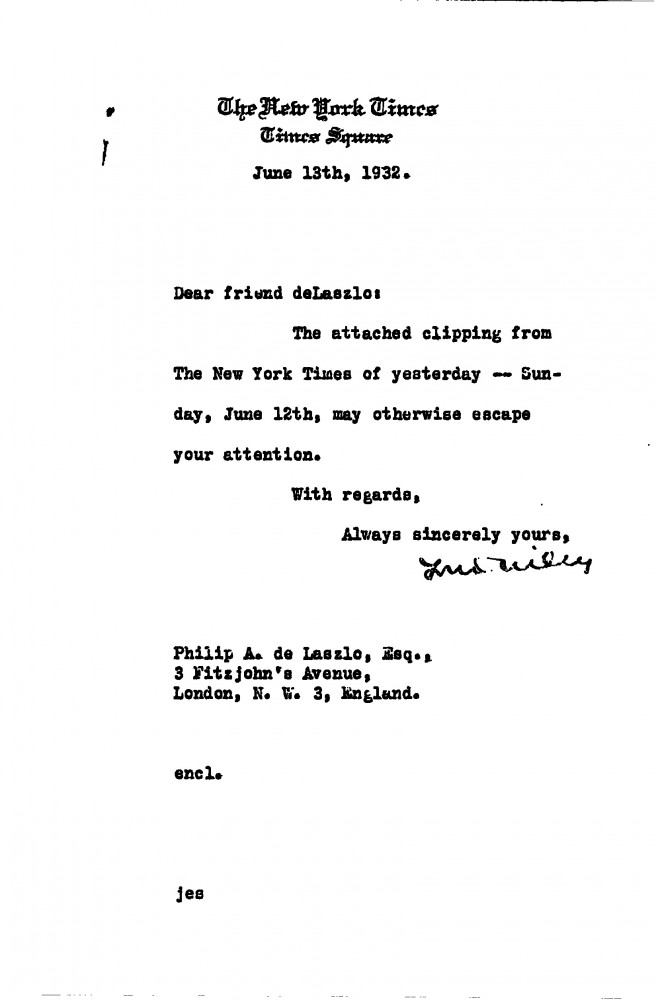Louis Wiley sends a newspaper clipping to de László.