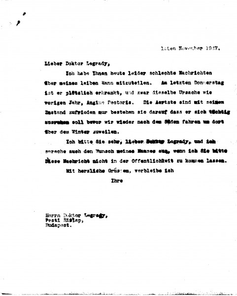 Lucy informs Légrády that de László has suddenly fallen ill with angina pectoris. He must take complete rest before traveling to the South for the winter. She emphasises that this news should remain strictly private.