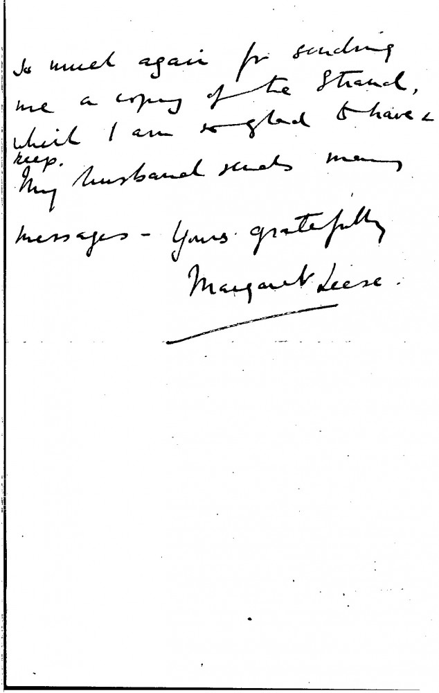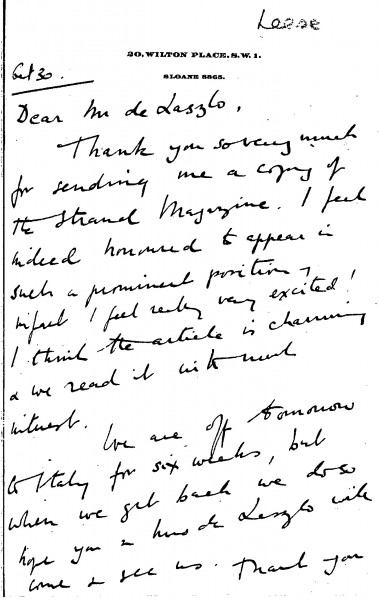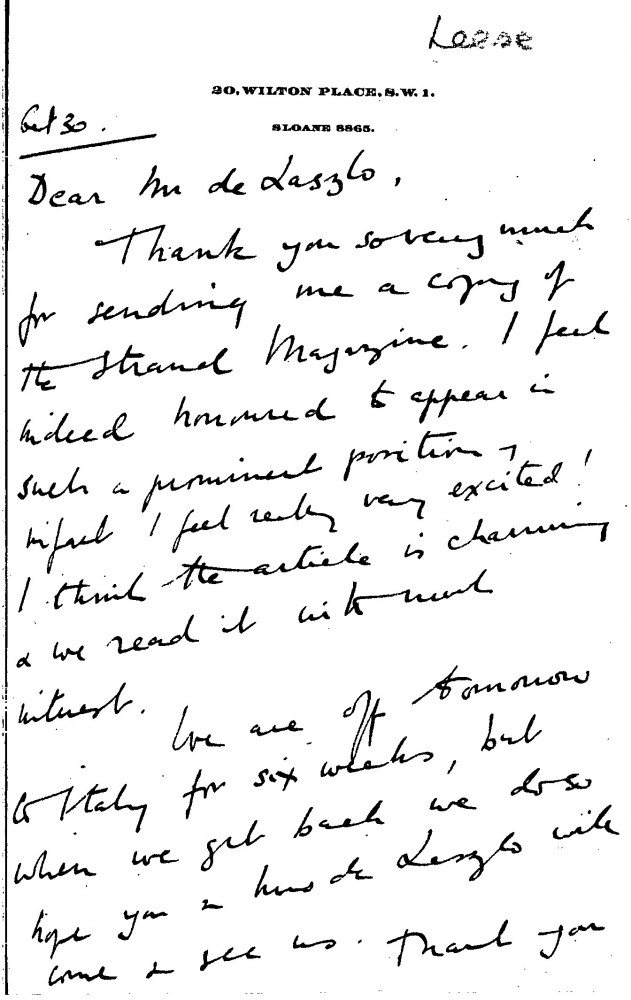 Margaret Leese thanks de László for sending a copy of "The Strand Magazine", expressing how honoured she feels to appear so prominently within it.