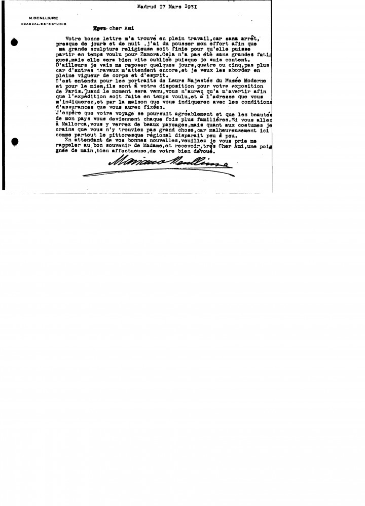 Benlliure has been working hard on a large religious sculpture. De László's portraits of the King and Queen of Spain [12400][12398] and of Benlliure himself [10155] are available for the artist's exhibition in Paris (Charpentier, 1931).