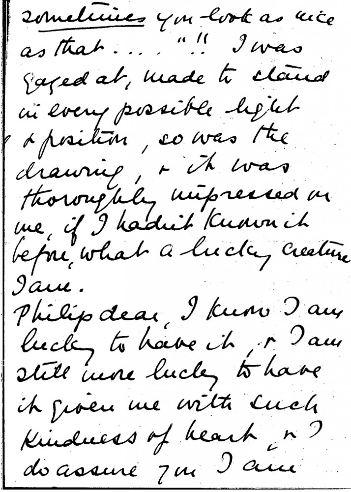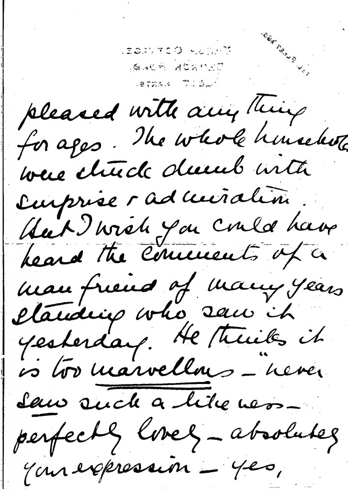 Marjorie Hodge expresses delight and gratitude for her portrait [5647], recounting the praise it has received. She notes the high price achieved at auction for a blank canvas (see fn. 2 in transcription).