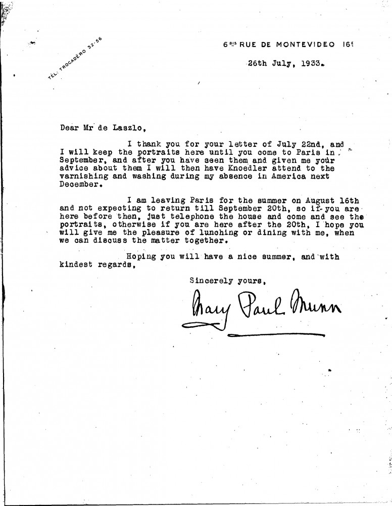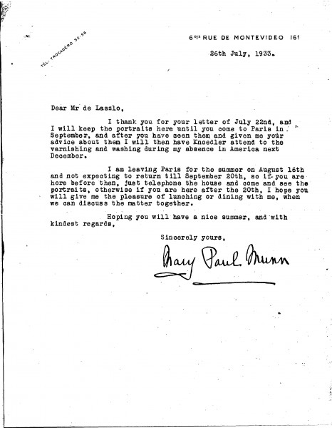 Concerning arrangements for de László to assess the portraits [8882][8976] in Paris in September prior to their cleaning and varnishing by Knoedlers.