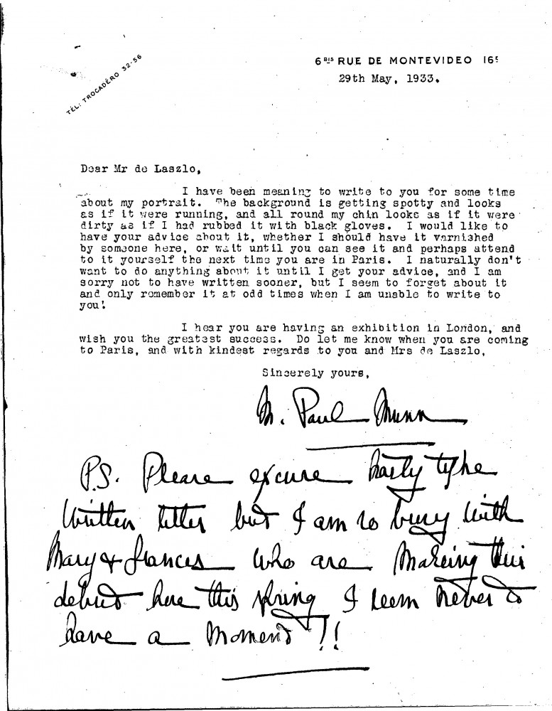 Seeking advice on varnshing/restoring a portrait: "The background is getting spotty and looks as if it were running, and all round my chin looks as if it were dirty as if I had rubbed it with black gloves". She wishes de László success with his forthcoming exhibition (Knoedler, 1933).
