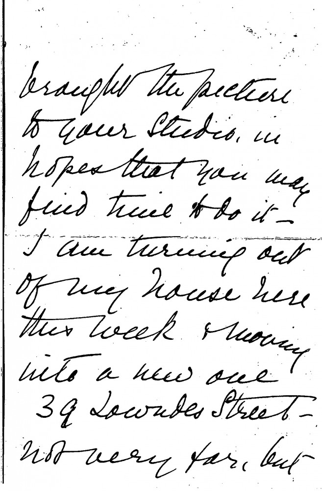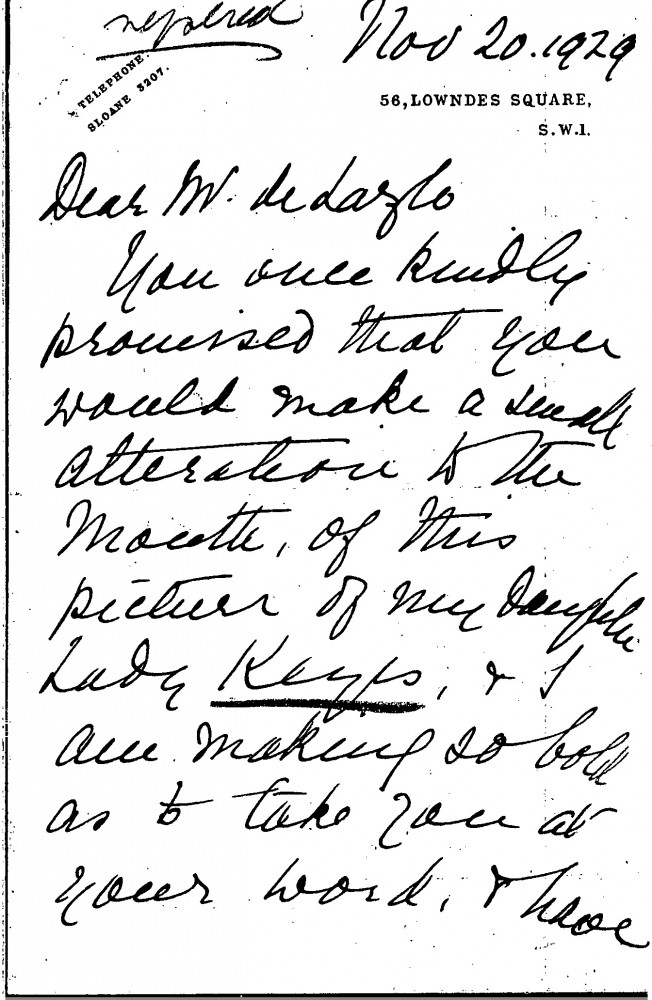 Elizabeth Bowlby reminds de László of his promise to make an alteration to the portrait of her daughter, Lady Keyes [5978], and has brought the picture to his studio.
