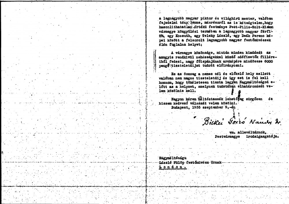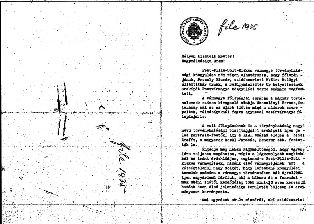 Commission to paint the portrait of Elemér Preszly, Főispán (County Prefect) of Pest-Pilis-Solt-Kiskun County, now Secretary of State and Deputy Minister of the Interior. A fee of 6000 Pengő is offered. For de László's draft reply agreeing to the commission, see DLA036-0002; commission also referred to in DLA036-0027 and DLA135-0060.