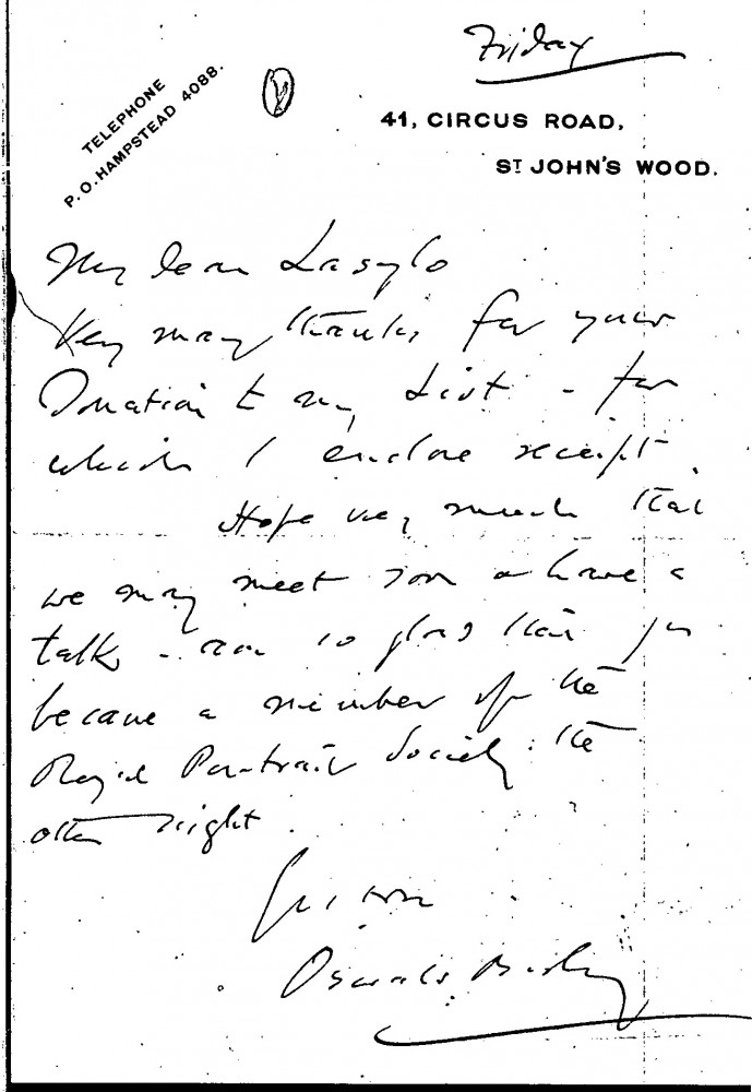 Oswald Birley thanks de László for a donation and expresses his pleasure at de László’s membership of the "Royal Portrait Society".