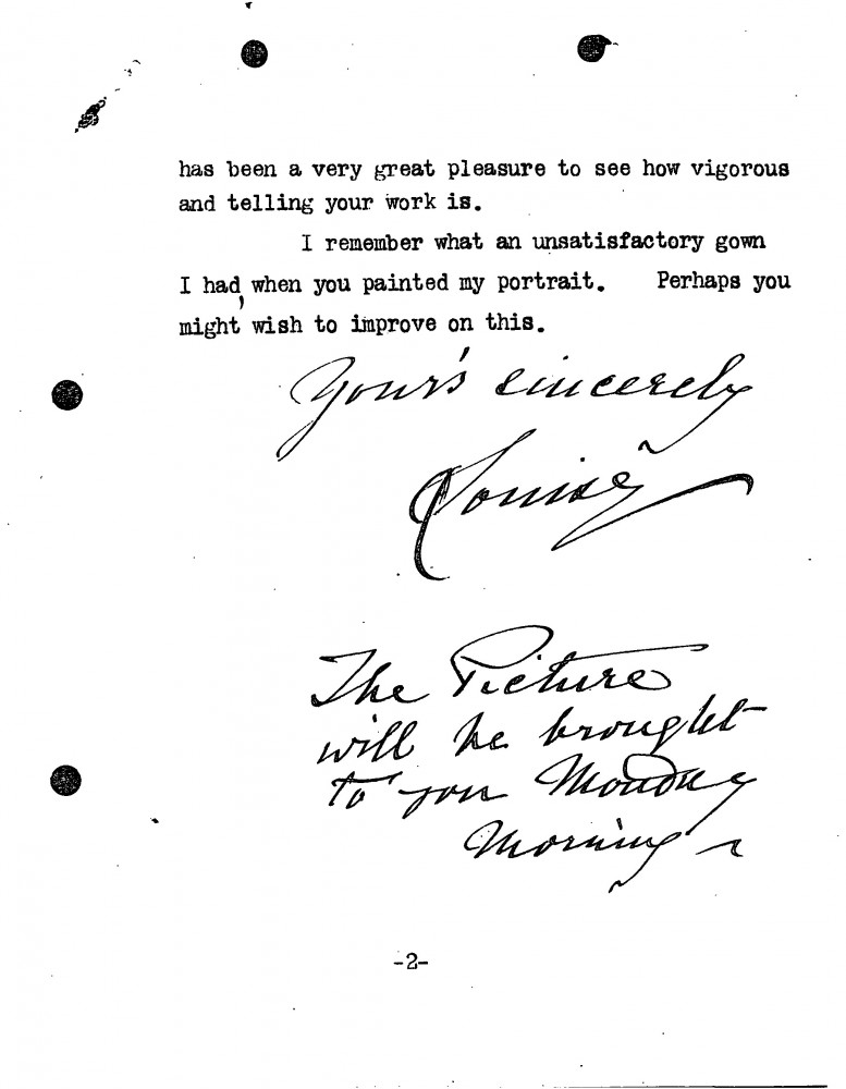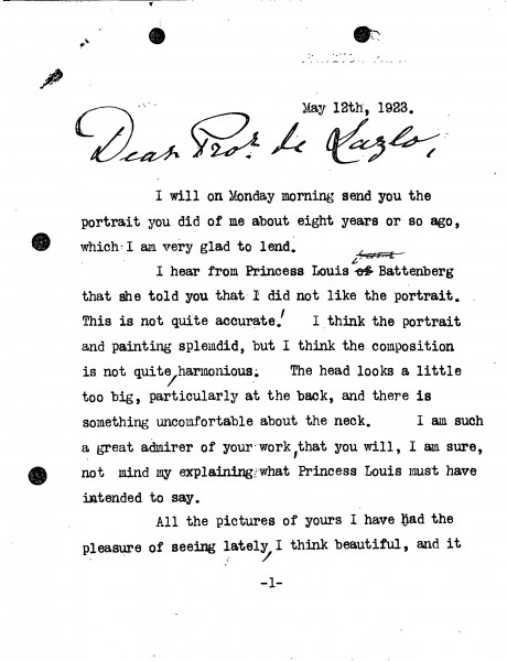 Princess Louise, Duchess of Argyll agrees to lend her portrait [2599] to de László's exhibition (French Gallery, June 1923). Reference to a criticism she gave to Princess Louis of Battenberg. Wonders if the artist might "improve" upon the "unsatisfactory gown" she wears in the portrait.